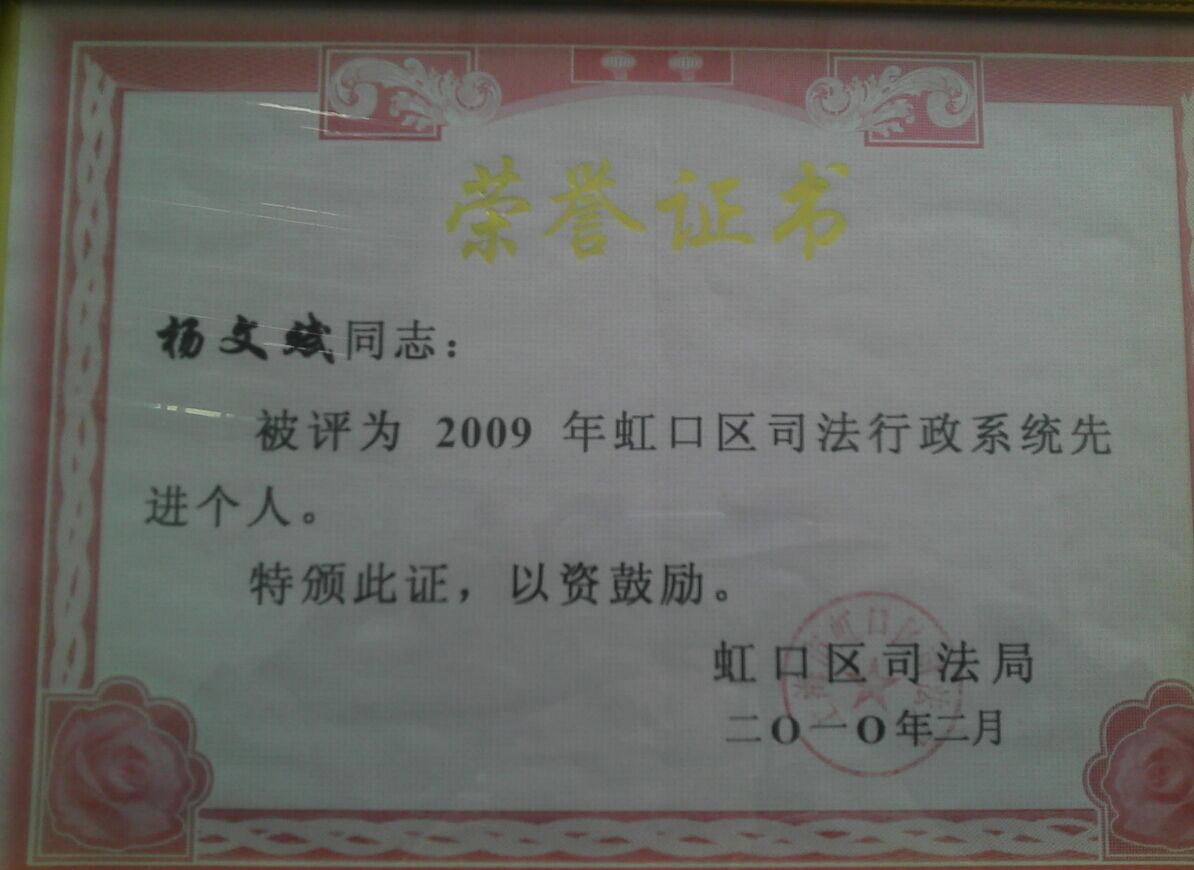 - 杨文斌律师被评为先进个人2015-08-04